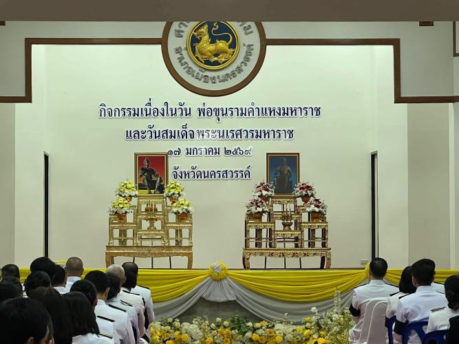 วันที่ ๑๗ มกราคม พ.ศ. ๒๕๖๙ ผู้ช่วยศาสตราจารย์ ดร.ไชยรัตน์ ปราณี อธิการบดีมหาวิทยาลัยราชภัฏนครสวรรค์ มอบหมาย ผู้ช่วยศาสตราจารย์นัฐท์ธีรนนช์ รอดชื่น รองผู้อำนวยการสำนักศิลปะและวัฒนธรรม ฝ่ายบริหารและยุทธศาสตร์การพัฒนาศิลปะและวัฒนธรรม เข้าร่วม พิธีวางพุ่มดอกไม้ และถวายราชสดุดีเนื่องในวัน “พ่อขุนรามคำแหงมหาราช” และวัน “สมเด็จพระนเรศวรมหาราช” โดยมี นางสาวชุติพร เสชัง ผู้ว่าราชการจังหวัดนครสวรรค์ เป็นประธานในพิธี ณ ศาลาประชาคม อำเภอเมืองนครสวรรค์ จังหวัดนครสวรรค์