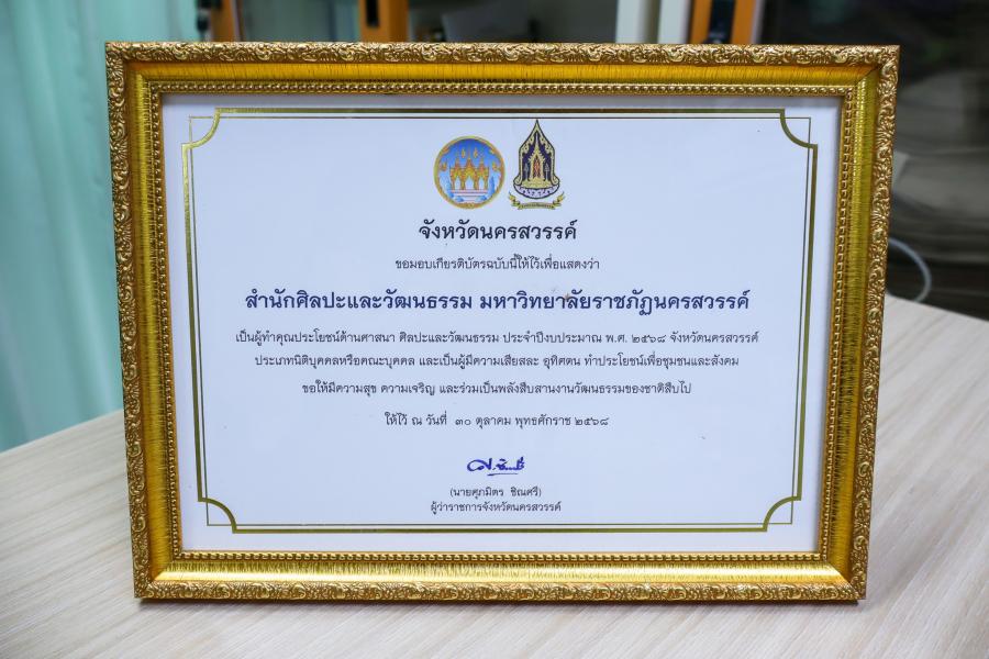 วันที่ ๓๐ ตุลาคม พ.ศ. ๒๕๖๘ ผู้ช่วยศาสตราจารย์ ดร.มงคล ศัยยกุล ผู้อำนวยการสำนักศิลปะและวัฒนธรรม เข้าร่วมพิธีรับเกียรติบัตรผู้ทำคุณประโยชน์ด้านศาสนา ศิลปะและวัฒนธรรม ประจำปีงบประมาณ พ.ศ. ๒๕๖๘ จังหวัดนครสวรรค์ โดยมีนายศุภมิตร ชิณศรี ผู้ว่าราชการจังหวัดนครสวรรค์ เป็นผู้มอบเกียรติบัตร ณ ห้องประชุมพุทธรักษา ชั้น ๔ อาคาร ๑ สำนักงานสาธารณสุขจังหวัดนครสวรรค์ อำเภอเมืองนครสวรรค์ จังหวัดนครสวรรค์
